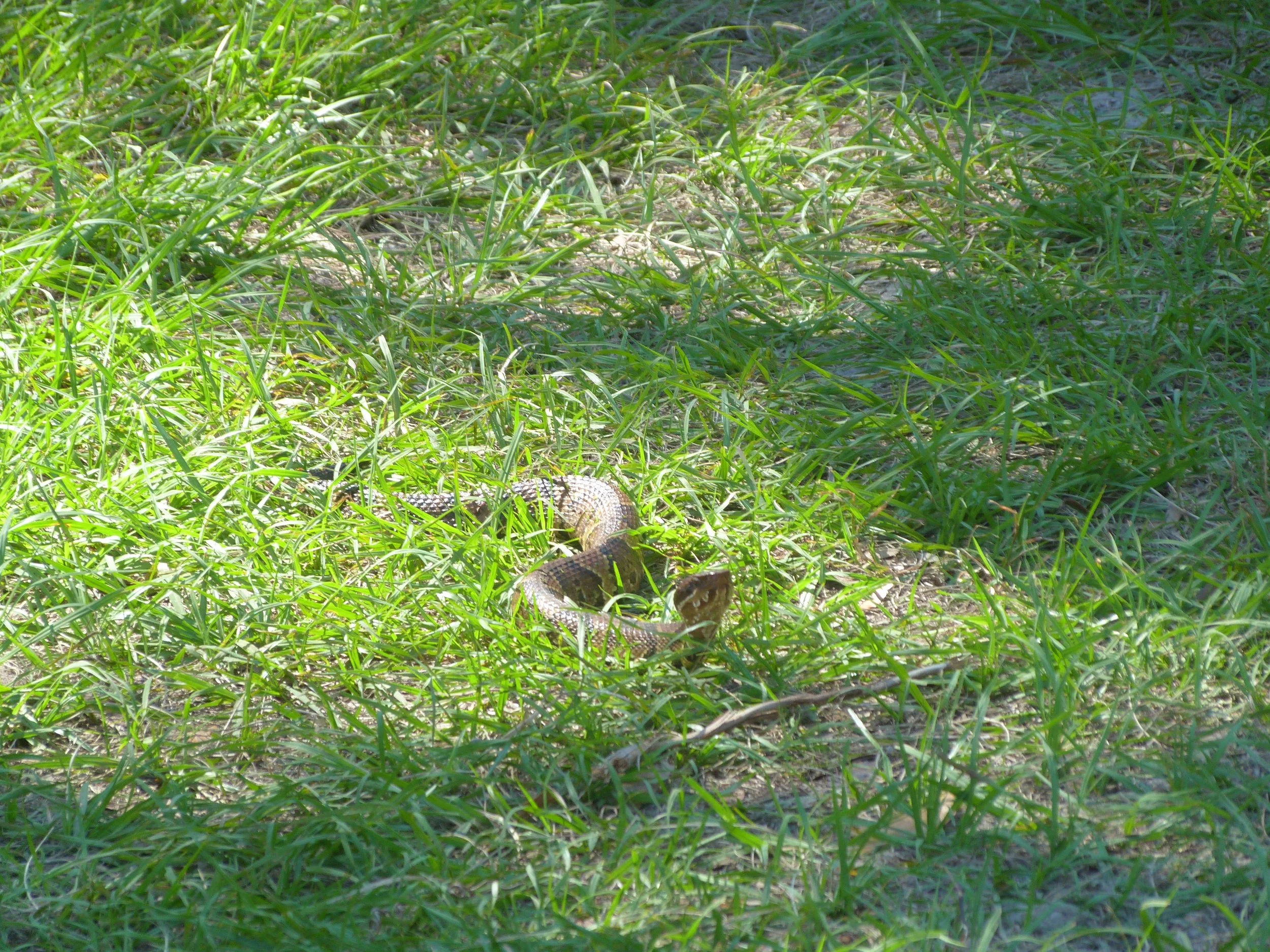 Most snakes will slither away when you come up on them, but not cottonmouths. They can be aggressive. It took Landon smashing a stick in front of the thing to get it to go away.