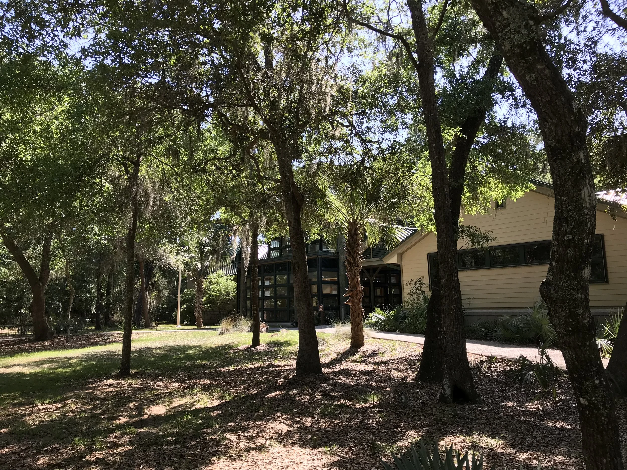 The Environmental Learning Center is housed under a blanket of oak trees and it has a large glass building at its center.